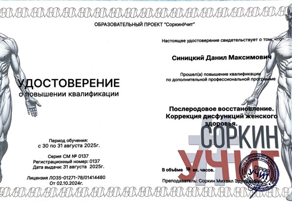 2025 г. Повышение квалификации. Образовательный проект "СоркинУчит". Послеродовое восстановление. Коррекция дисфункций женского здоровья.