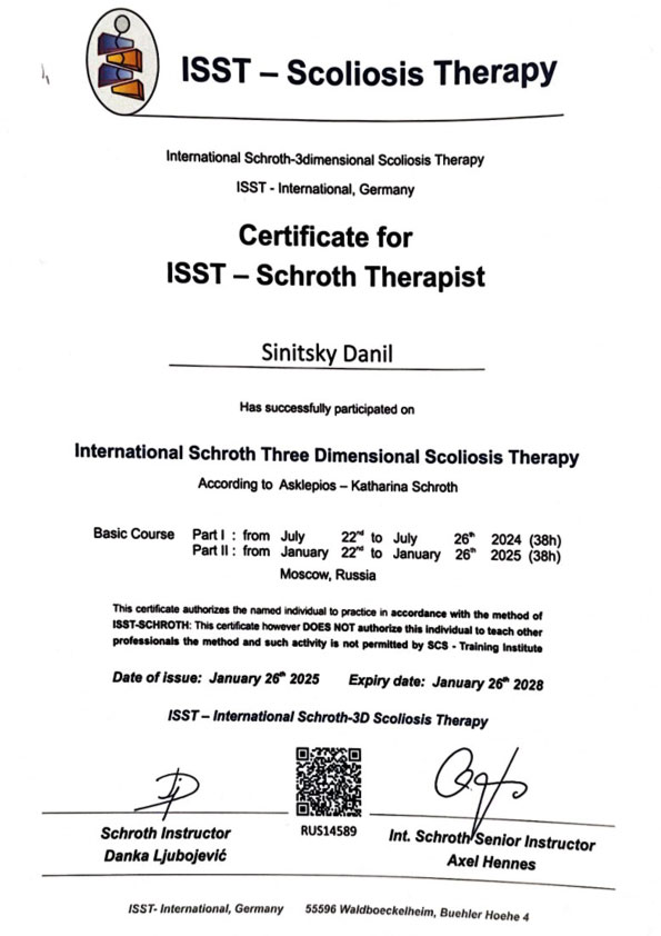 2024, 2025 г.г. Обучение ISST (международная трёхмерная терапия сколиоза по Катарине Шрот). Методика физиотерапии и реабилитации для лечения сколиоза